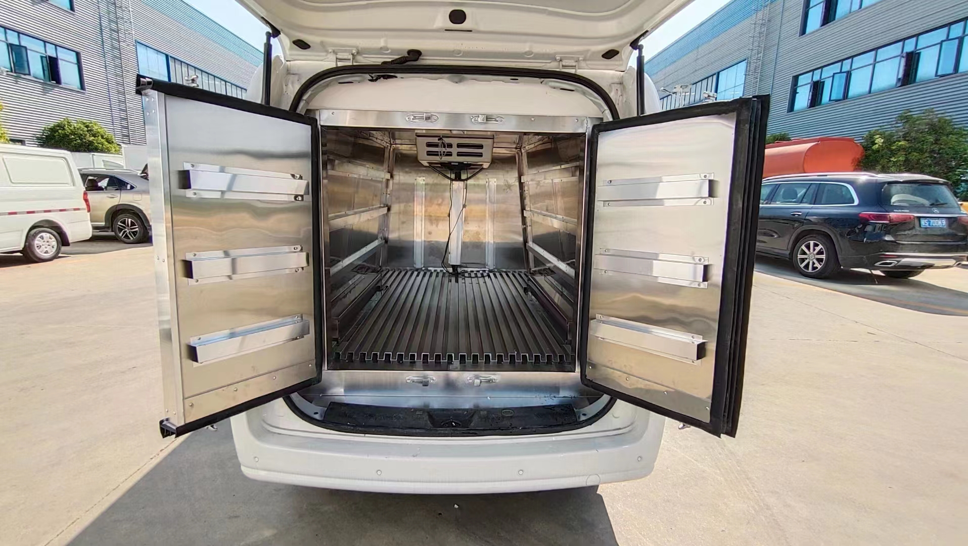 三、选装配置:可选装厢体侧门(单侧门或双开门),可选装铝合金导风槽(导风槽有助于冷气循环,提升制冷效果),可选装厢体顶部加固肉勾滑道(直滑道 或 对接互通式拐弯滑道)。可选装厢体内部采用全面不锈钢材质(海鲜运输必须加装,海水有腐蚀性),可选装280V-380V外接电源(停车熄火后可插电冷机继续制冷工作),可选装温湿度监控记录仪(带打印功能)。