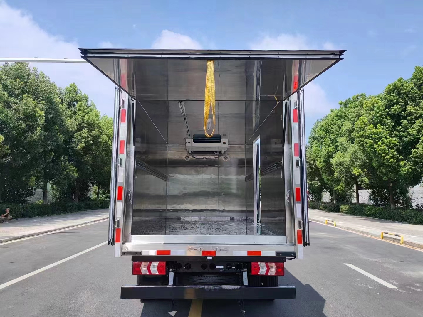 上装配置:厢体外蒙皮白色玻璃钢,内蒙皮不锈钢,后双开门,右侧单侧门,选装后内掀门(选装)。厢内安装紫外线消毒灯,喷雾消毒装置,厢体外置废液收集箱,安装-5或-15℃制冷机组。