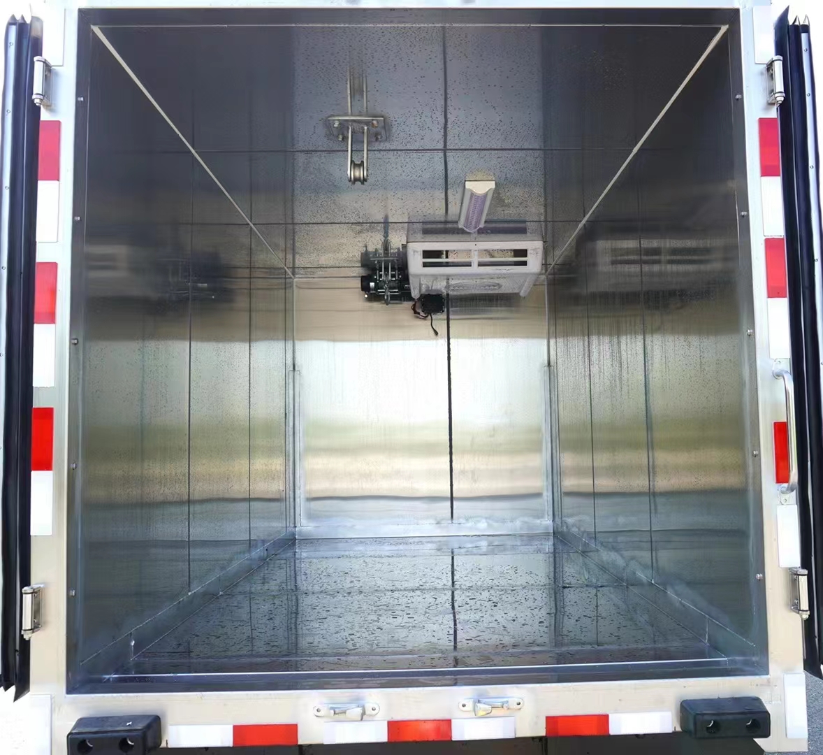 制冷系统:病死猪运输车是由车载制冷机组实现无害化处理车内部空间气体的流通和衡温,为保证病死猪在运输过程中对温度的要求,保证车厢内温度维持在-5°到-15°,有效减弱疫情病原的活性,保证工作人员的生命安全,在驾驶室就能实时监测到车厢内温度的变化,便于控制温度。